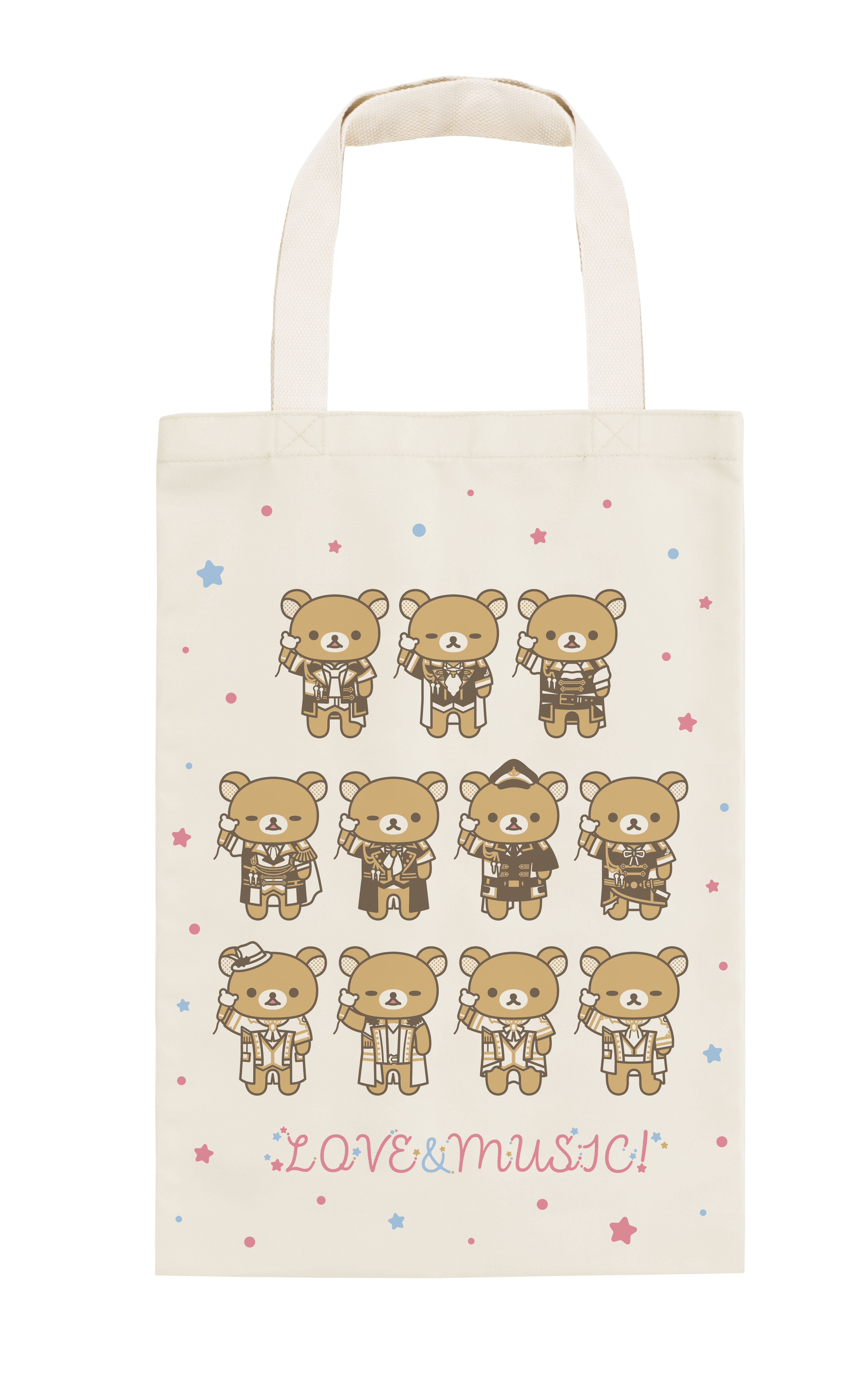 『うたの☆プリンスさまっ♪ マジLOVEレジェンドスター』の衣装を着たリラックマをデザインした、縦型のトートバッグです。ぬいぐるみや缶バッジなどを付けてオリジナルのアレンジが楽しめます。