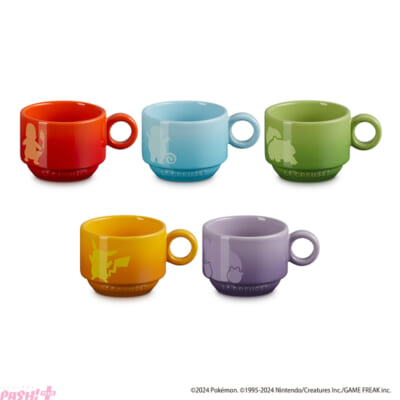 フシギダネ、ヒトカゲ、ゼニガメ、ピカチュウ、カビゴンのシルエットがプリントされたスタッキング・マグ。今回のために作られた新しいシェイプで、5色のカラー展開(パーム、オレンジ、ピュリストブルー、ネクター、ブルーベルパープル)。お子様から大人まで使いやすい200mlサイズで、内側にプリントされたモンスターボールのアイコンがポイントです。