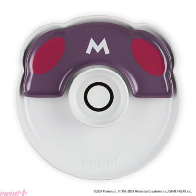 マスターボールの上部をイメージした紫のプレートと、ボタンをイメージさせる中央の小さな円形ディッシュ、白い直径25cmのプレートのセット。白いプレートにメインのお料理、紫のプレートに副菜、センターにソースや付け合わせを盛りつければワンプレートの完成。紫のプレートを取り外すと、白いプレートにはあの伝説のポケモンのシルエットが……。