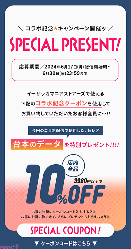 期間中にイーザッカマニアストアーズで使えるコラボ記念クーポン(3,980円以上で使える10%OFFクーポン)を使用してお買い物をしていただいた方【全員】に、今回のコラボ配信で使用した超レアな台本データを特別プレゼント!