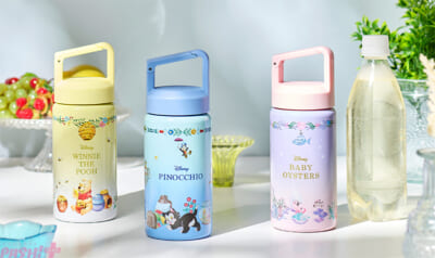 プーさんや『ピノキオ』のフィガロ、『ふしぎの国のアリス』のヤングオイスターがデザインされた炭酸飲料対応の華やかなカラーリングのウォーターボトルです。カラビナのように開閉するふたの持ち手が便利なポイントです。