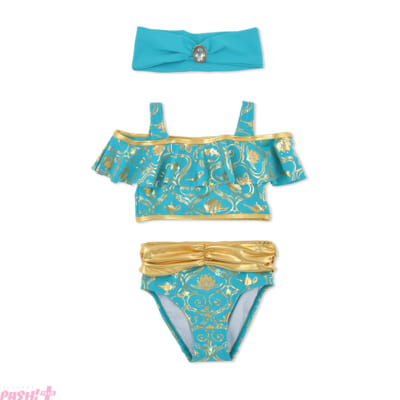 ジャスミンデザインは、セパレートタイプのスイムウェアとヘアバンドの3点セット。ジーニーやアブー、魔法のランプを描いたゴールドプリントを施し、ヘアバンドには、キラキラきらめく大きなビジューがついています。