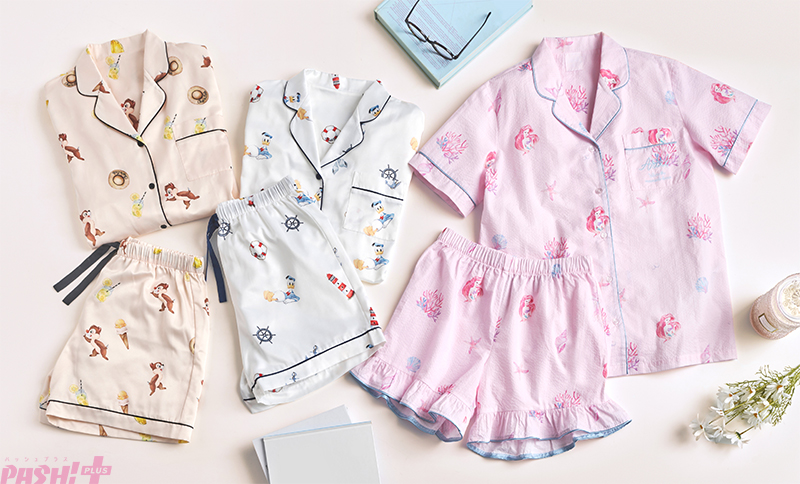 チップ&デールデザインの半袖パジャマは、アイスクリームや冷たいドリンク、麦わら帽子などを描いた夏らしい総柄デザインで、黒色のパイピングやウエストリボンがアクセントに♪ それぞれ刺しゅう入りの可愛い巾着が付いており、旅行に持っていくのもおすすめです。