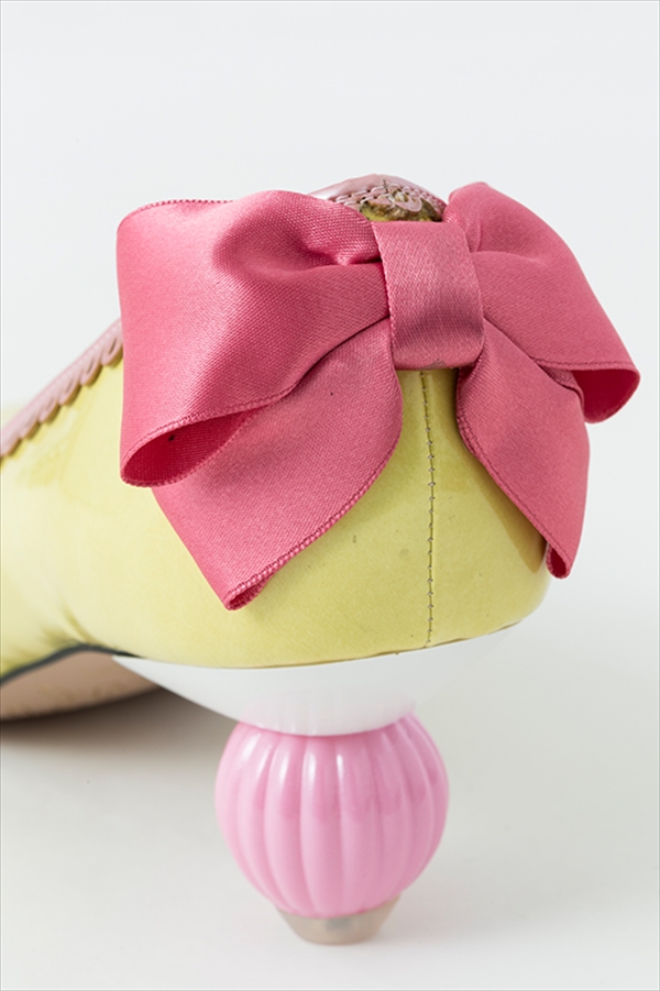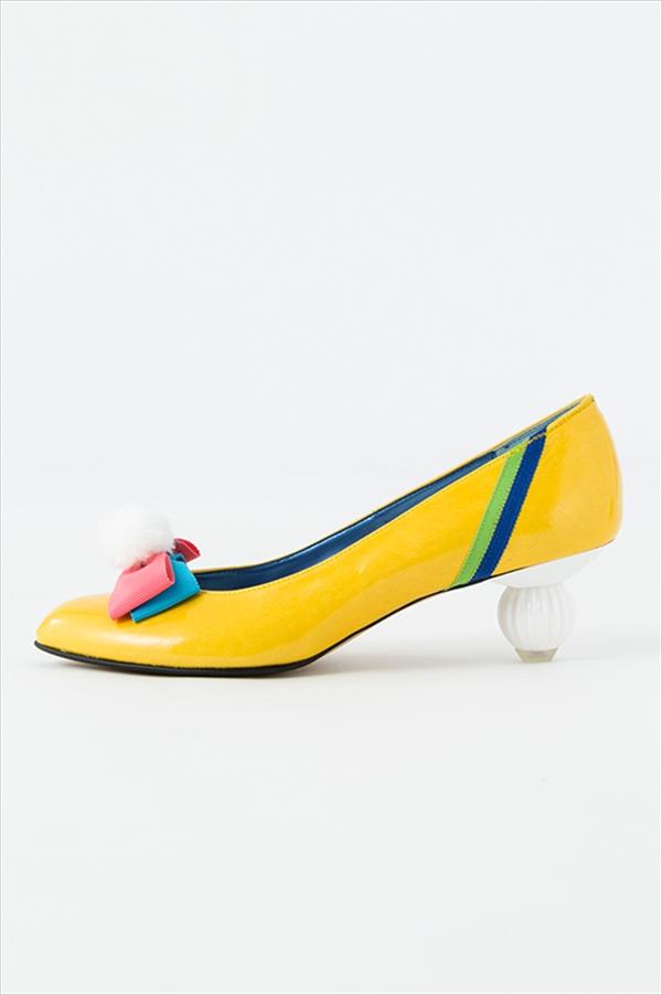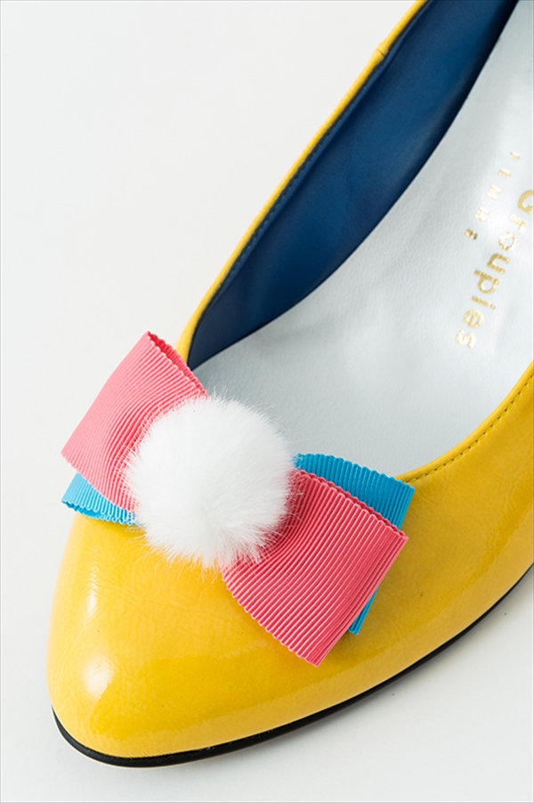 みれぃのサイリウムコーデをイメージし、カラフルでポップなパンプスに仕上げました。パンプスのサイドには衣装のカラーをイメージした色違いのリボンをたたき、つま先部分のリボンは衣装についているリボンを再現しています。