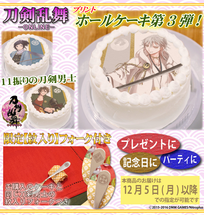 ゲーム『刀剣乱舞-ONLINE-』からプリントホールケーキ第3弾が2016年11月8日(火)に発売された。