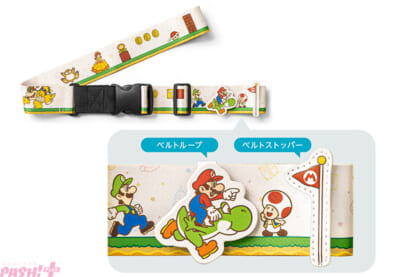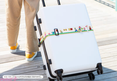 スーツケースの固定や目印になる、ワンタッチ式のスーツケースベルト。ベルトループを動かすと、マリオとヨッシーがコースを駆け抜けます。