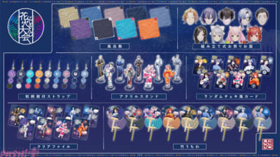 グッズラインナップは、ランダムチェキ風カード、クリアファイル、竹うちわ、アクリルスタンド、和柄根付ストラップ、風呂敷、組み立て式お祭りお面の7種類です。
