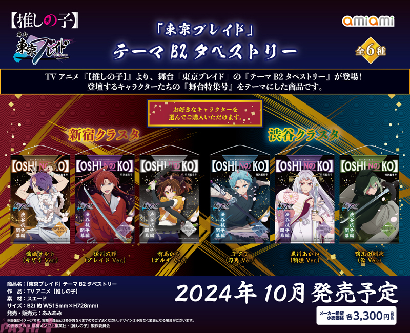 あみあみを運営する大網は、TVアニメ『【推しの子】』より、舞台「東京ブレイド」の鑑賞券風アクリルキーホルダー、テーマB2タペストリー、テーマアクリルキーホルダーを2024年10月に発売予定です。