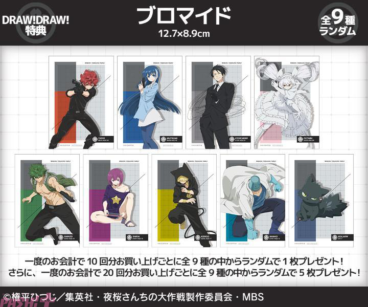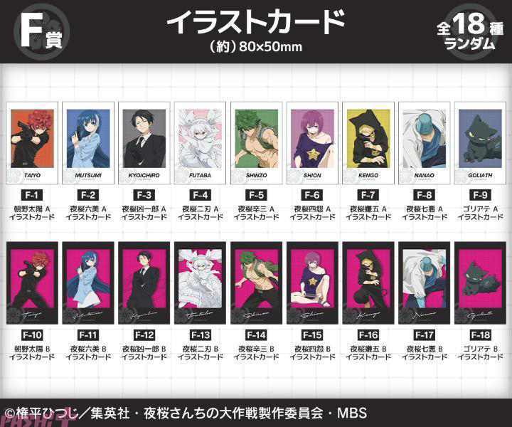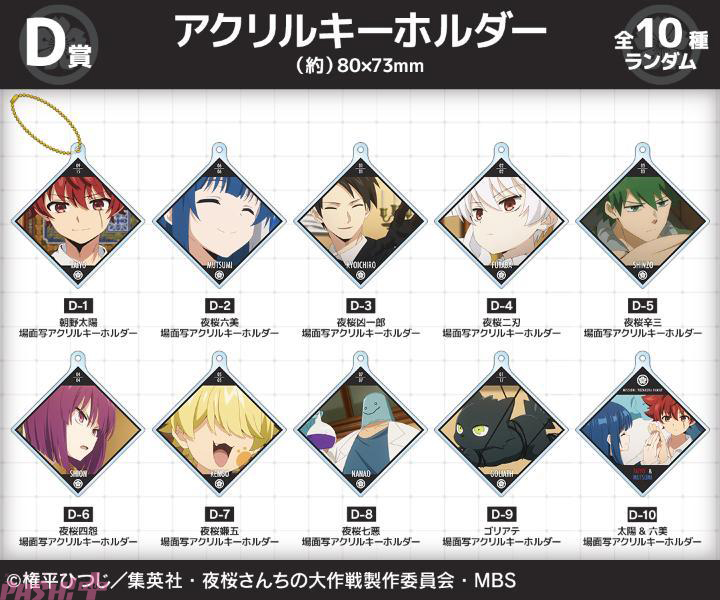 TVアニメ『夜桜さんちの大作戦』のオンラインくじが販売開始。一度の会計で10回分購入ごとに特典ブロマイド(全9種)の中からランダムで1枚、20回分ご購入ごとにランダムで5枚もらえます。