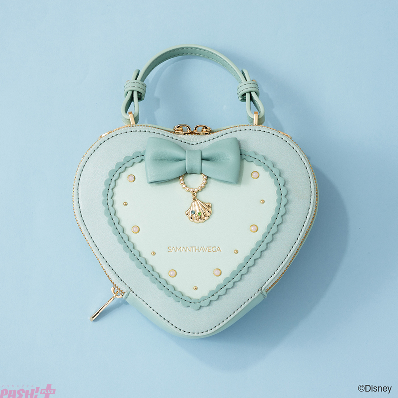 サマンサベガで大人気のハート型ショルダーバッグに「アリエル」をイメージしたモチーフやカラーリングを落とし込んだアイテム。バッグのフロントには立体的なリボンやオーロラのパールが散りばめられ、シェルのモチーフが「アリエル」のいる海を連想させるデザイン。