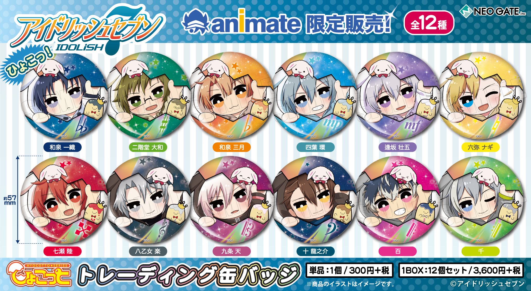 『アイドリッシュセブン』から、キャラクターがタマゴから顔を出している「ひょこっとシリーズ」のグッズが登場する。ラインナップは「ラメきらアクリルチャーム」、「トレーディング缶バッジ」、「クリアファイル」の3種類で、いずれも和泉一織、二階堂大和、和泉三月、四葉 環、逢坂壮五、六弥ナギ、七瀬 陸、八乙女 楽、九条 天、十 龍之介、百、千の全12種となっている。発売日は2016年12月31日(土)で、アニメイト限定商品となっている。