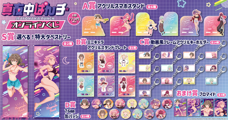 KADOKAWAは、運営するオンラインくじサービス「くじ引き堂」において、TVアニメ『真夜中ぱんチ』の豪華賞品が手に入る<真夜中ぱんチ オンラインくじ>を、2024年8月22日(木)12時より販売します。