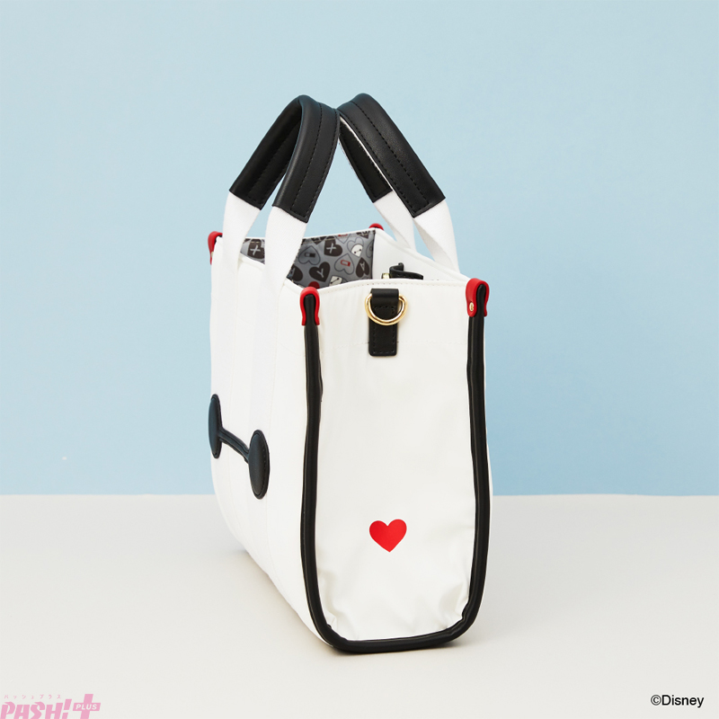 バッグのサイドには「ベイマックス」の優しさや愛を感じるハートモチーフのデザインが。裏地には「BAY MAX」の文字や「ベイマックス」の表情、バッテリーアートなどをオリジナル総柄でデザイン。内側まで世界観溢れる仕様に。