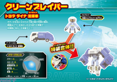また、シールブックのパワーバランスに書いてある「スピード、精密動作性、耐久性」 などの性能や強さを読み取り、ジョブレイバーの特徴を論理的に学ぶ遊びが楽しめます。さらに、シール台紙に貼った後も、身近なものにシールを貼り直して、「これとこれを組み合わせて合体したら、かっこいい!」というように、自由にデザインして表現することもできます。