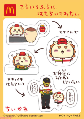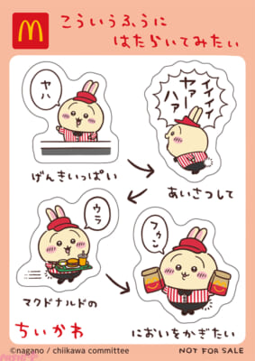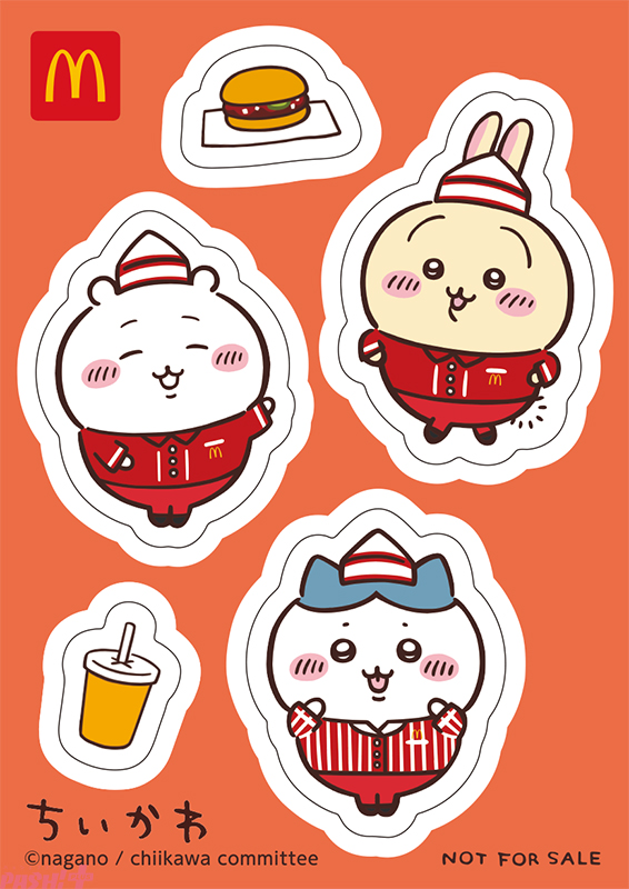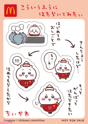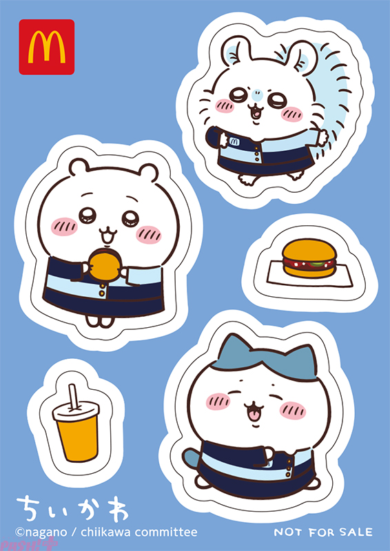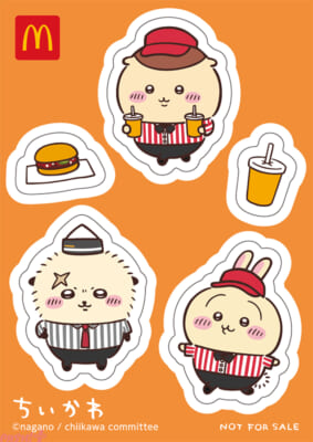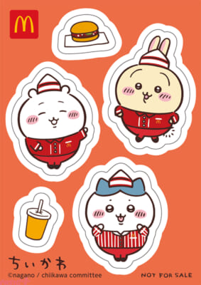 SNS発の人気キャラクター「ちいかわ」がハッピーセットに1年ぶりの登場です。“ちいかわ”や”ハチワレ””うさぎ”を筆頭に、”モモンガ”や“ラッコ”などのキャラクターたちが歴代クルーのユニフォームを着たマクドナルドオリジナルデザインのシールです。シールは3枚セットになっており、キャラクターが大きく描かれたシールが1枚、“こういうふうにはたらいてみたい”というシールが1枚、仲間たちと一緒のシールが1枚のセットで、全5種類が登場します。