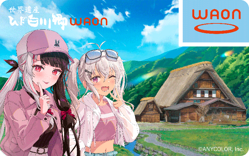 コラボレーションカード2枚目は「世界遺産 ひだ白川郷WAON」。岐阜県白川村の白川郷の「合掌造り集落」を旅する「夜見れな」と「魔使マオ」を撮りおろしたオリジナルデザインカードとなります。お買物いただいたご利用金額の一部が、「世界遺産合掌造り集落保存協力寄付金」に寄付されます。