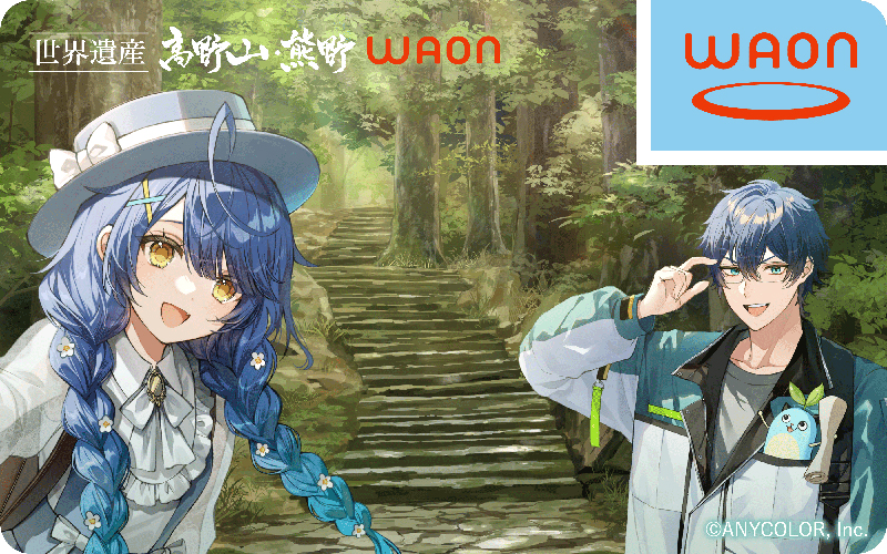 コラボレーションカード6枚目は「世界遺産 高野山・熊野WAON」。熊野古道大門坂を旅する「レオス・ヴィンセント」と「天宮こころ」を撮りおろしたオリジナルデザインカードとなります。お買物いただいたご利用金額の一部が、「世界遺産 紀伊山地の霊場と参詣道」の保全と活用に役立てられます。