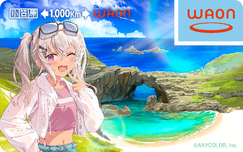コラボレーションカード5枚目は「小笠原←1,000km→WAON」。小笠原諸島の南島を旅する「魔使マオ」を撮りおろしたオリジナルデザインカードとなります。お買物いただいたご利用金額の一部が、世界自然遺産小笠原諸島の環境保全を応援します。