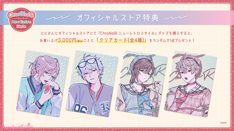 「ChroNoiR ニューレトロスタイル」のタグがついている商品を税込3,000円以上ご購入いただいたお客様に「特典クリアカード(全4種ランダム)」をプレゼント!