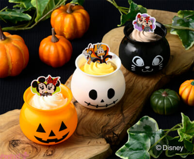 毎年好評のパンプキンプリン、チョコプリンに加え、今年はアップルカスタード味のプリンが初登場。それぞれジャック・オ・ランタン、黒猫、ガイコツをモチーフにした器入りで、上面にハロウィン仕様のディズニーキャラクターのピックが飾ります。