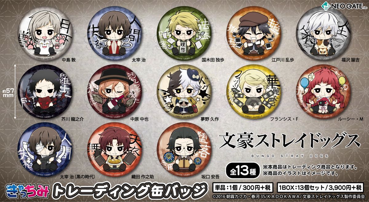トレーディング缶バッジは、中島 敦、太宰 治、国木田独歩、江戸川乱歩、福沢諭吉、芥川龍之介、中原中也、夢野久作、フランシス・F、ルーシー・M、太宰 治(黒の時代)、織田作之助、坂口安吾の全13種類からランダムで1種が封入されている。また、1BOXを購入すると全13種をコンプリートすることができる。