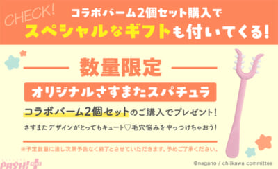 コラボクレンジングバーム2個セットに『さすまたスパチュラ』を付けた特別セットも数量限定で用意。作中に登場するちいかわの武器『さすまた』と、クレンジングバームをすくう『スパチュラ』を組み合わせた、ここでしか手に入らないとっておきのアイテムです。