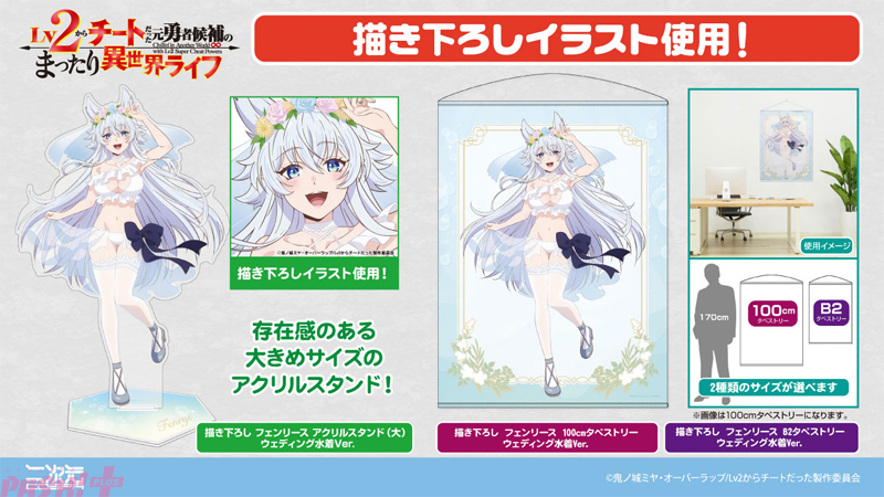 『Lv2からチートだった元勇者候補のまったり異世界ライフ』より、「描き下ろし フェンリース アクリルスタンド(大)ウェディング水着Ver.」「描き下ろし フェンリース 100cmタペストリー ウェディング水着Ver.」など、新グッズが二次元コスパから登場です。通販を含むコスパオフィシャルショップほかにて予約受付中。<2025年3月上旬>発売予定です。