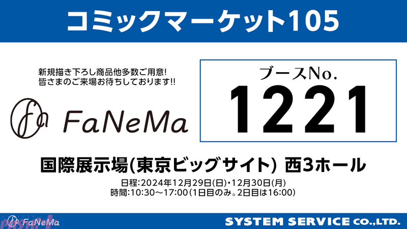 システムサービスは、アニメ・マンガ・ゲーム作品等のキャラクター商品の企画・製作・販売をする自社ECサイト「FaNeMa」ブランドにて、2024年12月29日(日)・12月30日(月)に開催される「コミックマーケット105」に出展します。