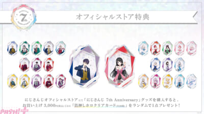 にじさんじオフィシャルストアにて「にじさんじ 7th Anniversary」グッズを購入すると、お買い上げ3,000円(税込)ごとに「箔押しホロクリアカード(全28種)」をランダムで1点プレゼント!