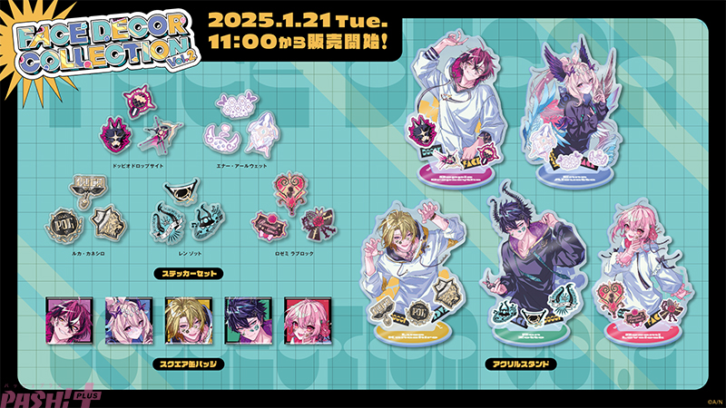 ラインナップは撮り下ろしビジュアルを使用したアクリルスタンド、スクエア缶バッジ、ライバー達がビジュアル内で使用しているステッカーセットの計3種です。