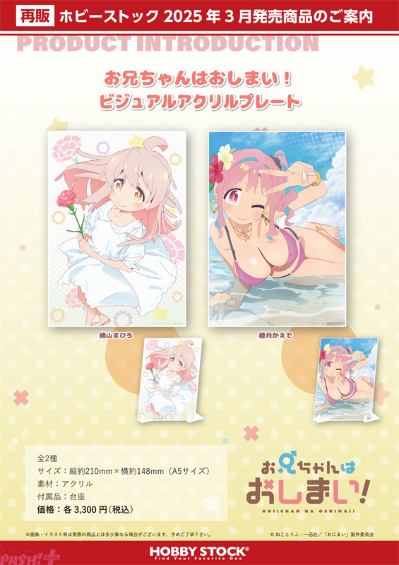 TVアニメ『お兄ちゃんはおしまい!』から、イラストを堪能できるアクリルプレートが再販決定! 付属の台座を使用し、机や棚などに立てて飾ってお楽しみください。
