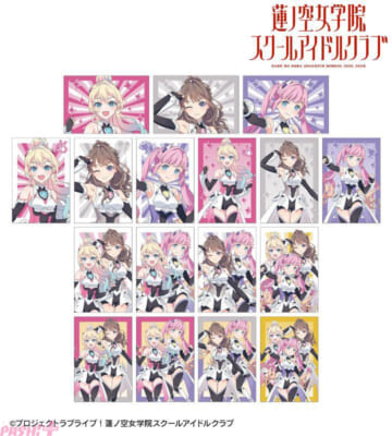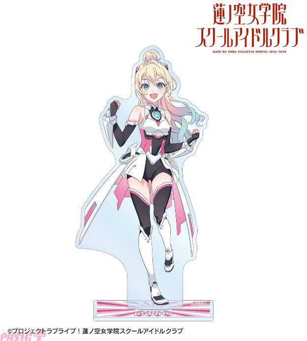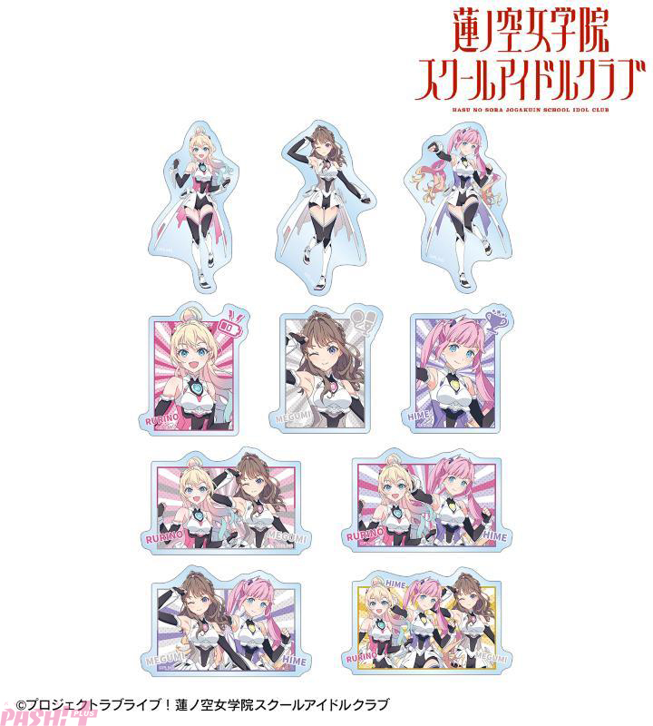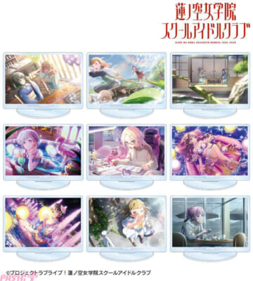 日野下花帆、村野さやか、乙宗梢、夕霧綴理、大沢瑠璃乃、藤島慈、百生吟子、徒町小鈴、安養寺姫芽のカードイラスト、作品ロゴをアクリルスタンドに仕上げました。お部屋やデスクまわりなどに飾って、メンバーとの日常をお楽しみください。