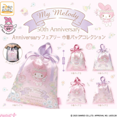 【サンリオ】かわいい50周年記念デザインはプレゼント用にもピッタリ! 『マイメロディ Anniversaryフェアリー 巾着バッグコレクション』がカプセルトイに登場