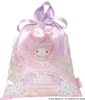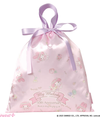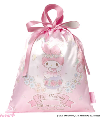 光沢感のある生地で、リボンでできた持ち手も可愛い! たっぷり入る巾着として使ったり、ちょっとした買い物にバッグとして使ったり用途はいろいろ。いろんなところに持ち歩いて、マイメロディの50周年を一緒にお祝いしてみては?