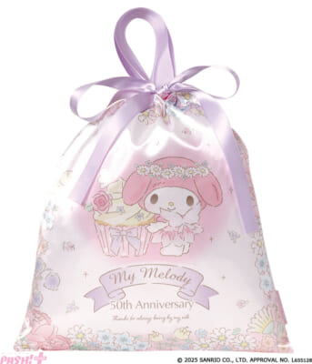 マイメロディの巾着バッグがカプセルトイで登場! 妖精になったマイメロディがお花とスイーツでみんなにありがとうを伝える、50周年を記念したデザインを使用しています。
