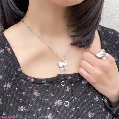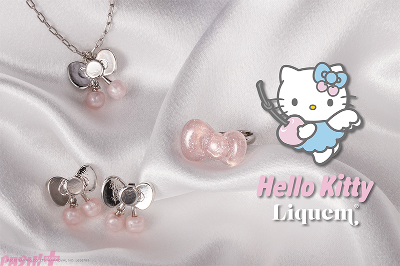 特別に書き起こされたLiquem仕様のハローキティは、チェリーのアクセサリーを身につけており、そのリボンをモチーフにしたアクセサリーコレクションが完成しました。