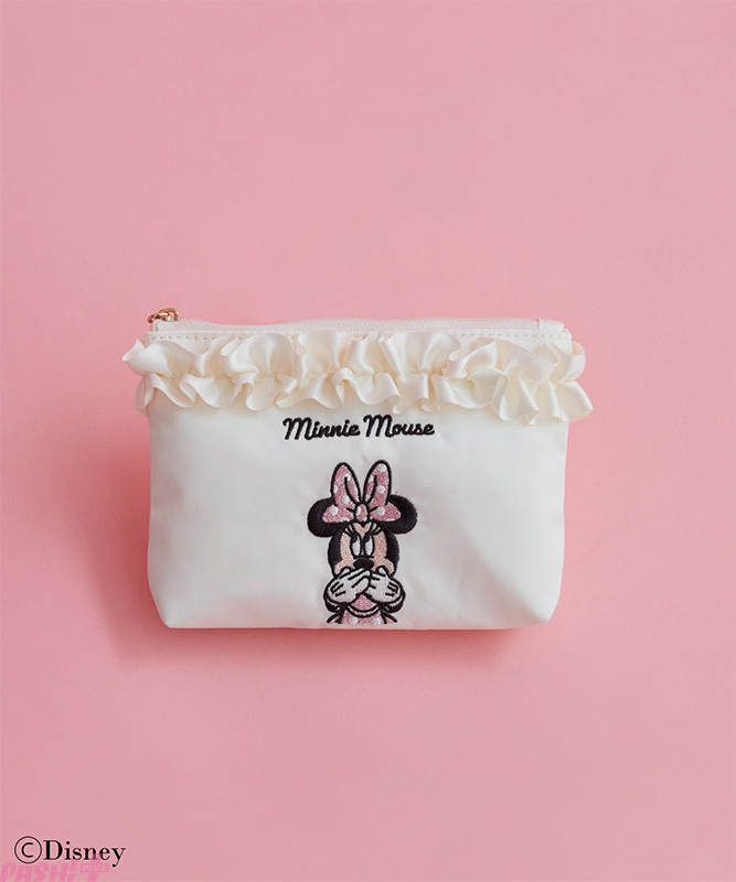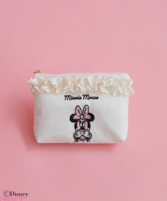 本コレクションは、ミニーマウスの刺繍にグレーやピンクのパステルカラーを使用し、全体を淡いトーンで春らしい雰囲気に仕上げ、ゴールドの金具をプラスした大人可愛いデザインです。Maison de FLEURのアイコンであるリボン付きのトートバッグとショルダーバッグは、サテン生地を採用しブランドらしい上品な印象に。同素材のポーチには、ボリュームたっぷりのフリルをあしらいました。