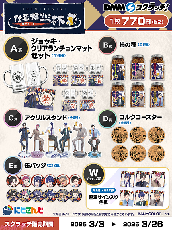 DMM.comは、ハズレなしのオンラインくじサービス「DMMスクラッチ」にて、2025年3月3日(月)より『にじさんじ「仕事帰りに一杯」 スクラッチ』を販売します。