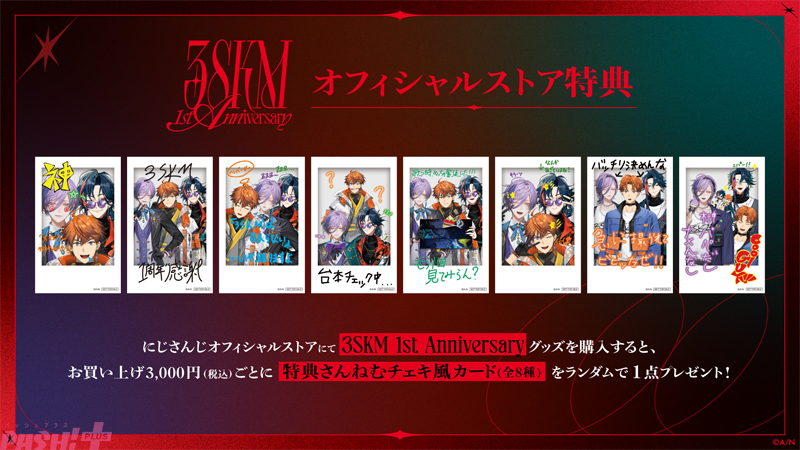 にじさんじオフィシャルストアにて「3SKM 1st Anniversary」グッズを購入すると、お買い上げ3,000円(税込)ごとに 「さんねむチェキ風カード(全8種ランダム)」を1枚プレゼントいたします。