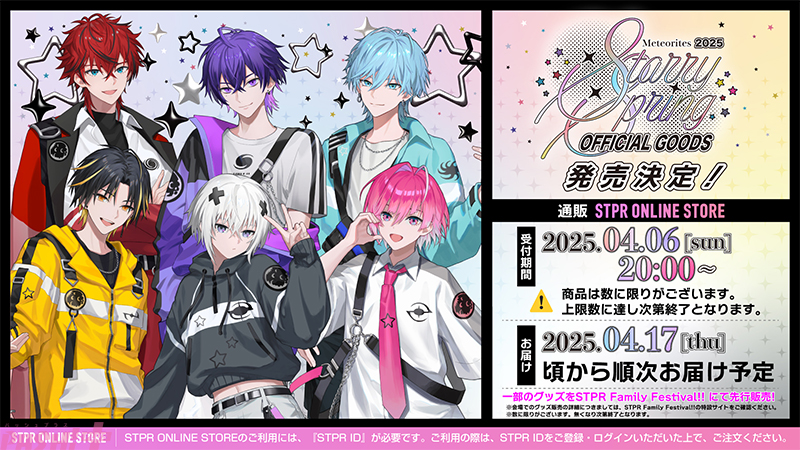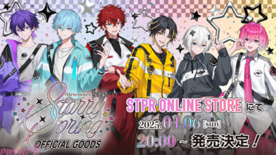 STPR所属の2.5次元歌い手アイドルグループ“めておら – Meteorites -”の春グッズ「めておら – Meteorites – 2025 Starry Spring OFFICIAL GOODS」が4/6(日)20:00よりSTPR ONLINE STOREにて通販受付開始となります。