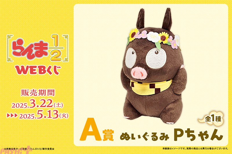 上位賞には描き起こしイラストをそのままふかふかの抱き心地でとっても可愛く立体化したぬいぐるみを始め、美麗なイラストを大きく飾れるA3ビジュアルパネル、定番のアクリルスタンドや缶バッジ、小物を入れるのに便利なスライダーポーチなど、豪華グッズラインナップとなっています。また、店頭限定ラストWIN賞はハチの着ぐるみを着たPちゃんのぬいぐるみとなっています。