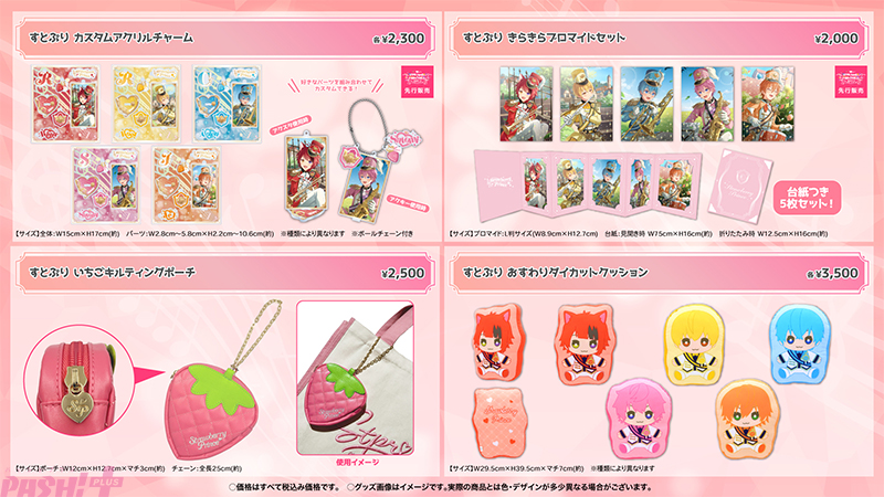 人気の缶バッジ、カードなどの定番商品をはじめ、いつも身に着けておけるアクリルカラビナやステッカーセット、いちごキルティングポーチなど全9アイテムが勢揃い。このうち、アクリルカラビナ・カスタムアクリルチャーム・きらきらブロマイドセットの3アイテムは、『STPR Family Festival!!』の会場にて先行販売されます。