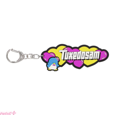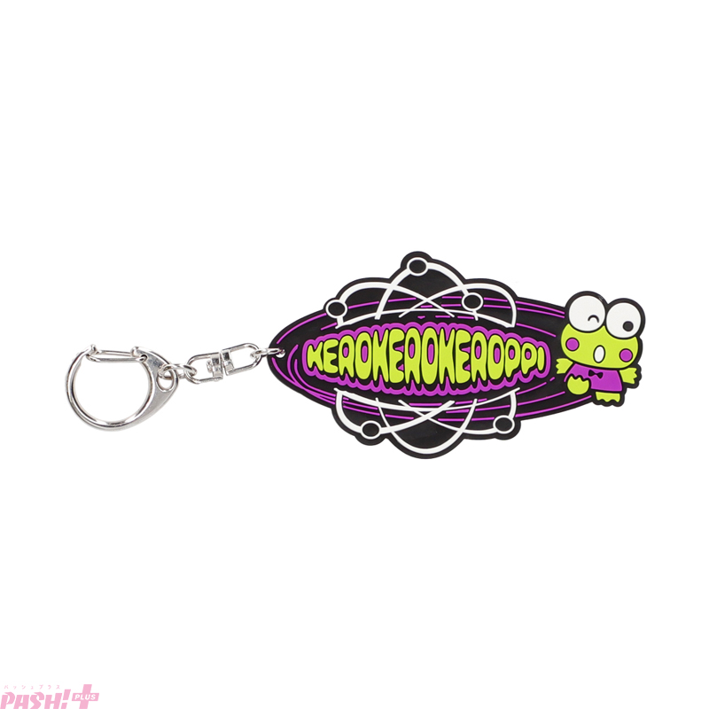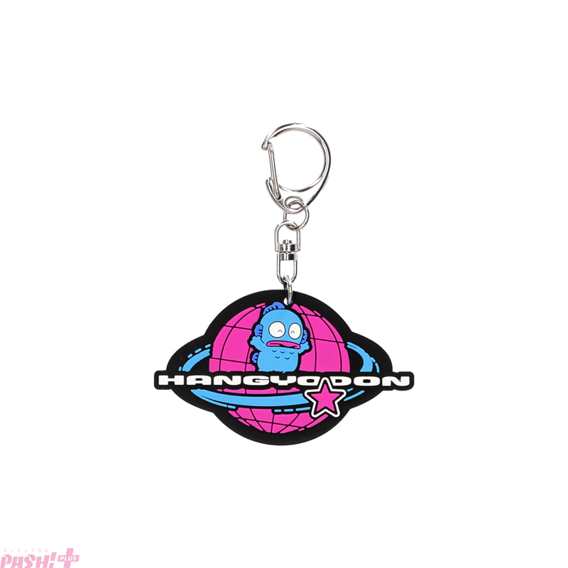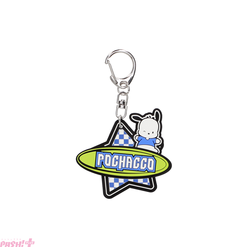 サンリオの人気6キャラクターユニット『はぴだんぶい』のキャラクターのポチャッコ、タキシードサム、けろけろけろっぴ、バッドばつ丸、ハンギョドン、あひるのペックルの名前を、ポップでレトロな雰囲気のフォントで表現したラバーキーホルダーです。2000年代に若者の間で流行したブランドのロゴをイメージしたデザインになっています。