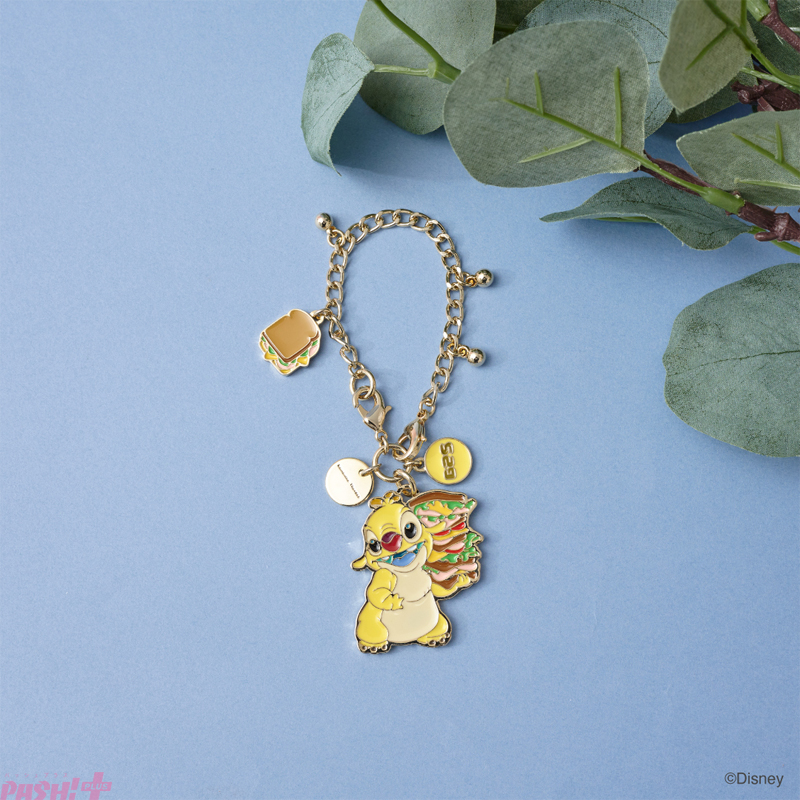 「スティッチ」、「エンジェル」、「ルーベン」のアートをデザインしたチャーム。「スティッチ」達が暮らすハワイを連想させる葉やブルー、ピンクのストーンがチェーンに施されたアイテムです。同シリーズのバッグや小物とあわせて世界観を楽しんでください。