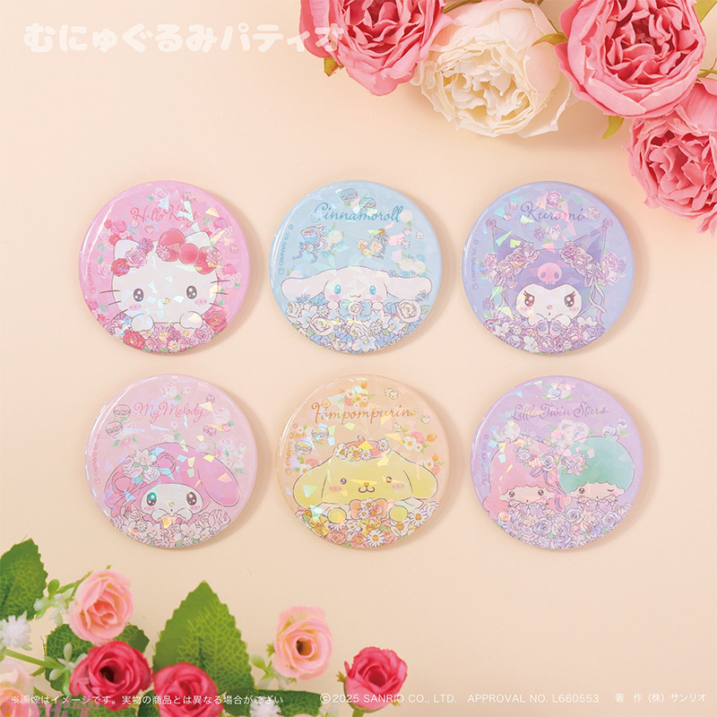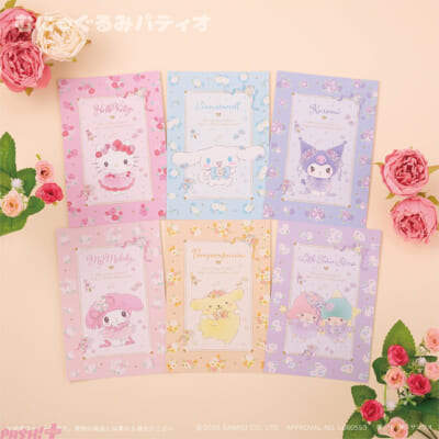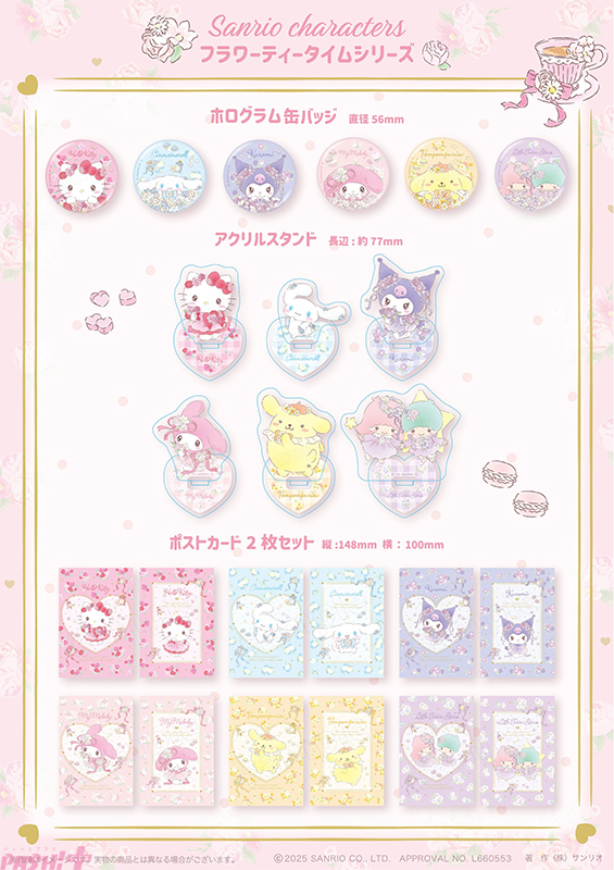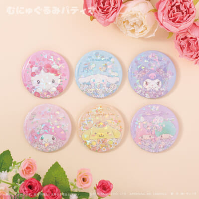 サンリオキャラクターズと一緒にお花見しよう! お花の飾りがかわいいホログラム缶バッジ、アクリルスタンド、ポストカード2枚セットが登場します。