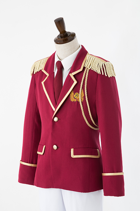 高等部の男子生徒が着用する冬制服のジャケットセット。金色のラインが映えるワインレッドのジャケットに、ネクタイ、飾紐のセットです。