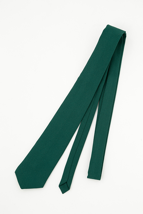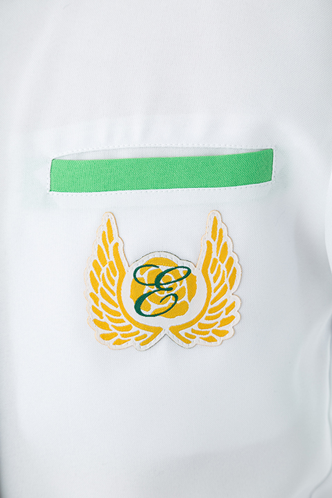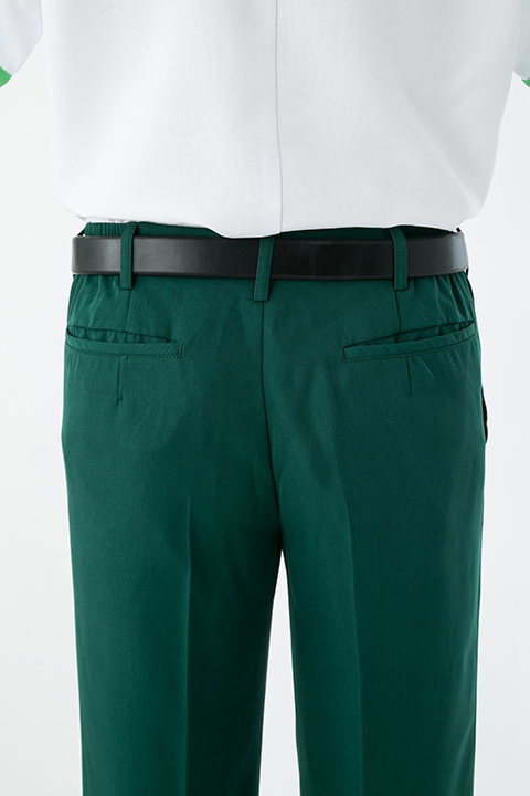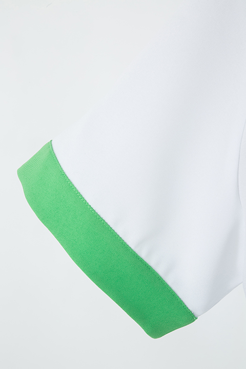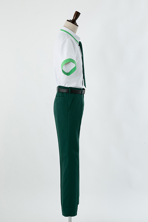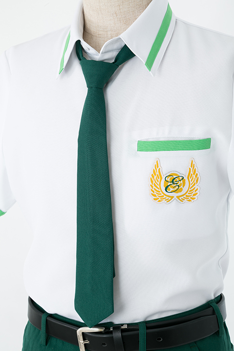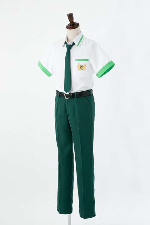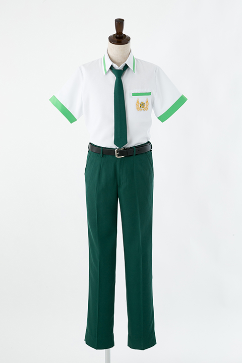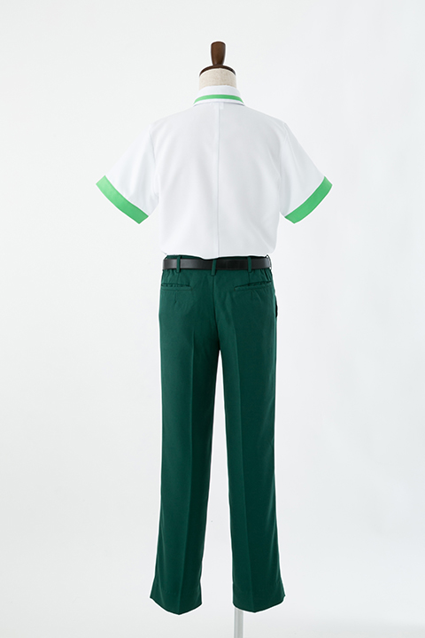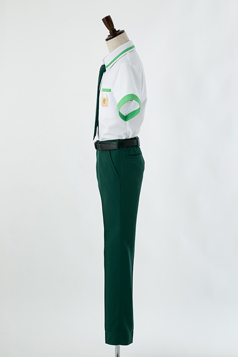 中等部の男子生徒が着用する夏制服。黄緑色のラインが入ったシャツに、ネクタイ、パンツのセットです。シャツは通気性がよく、シワになりにくいオックス生地を使用。設定イラストに合わせ、背中心で身頃を切り替えています。