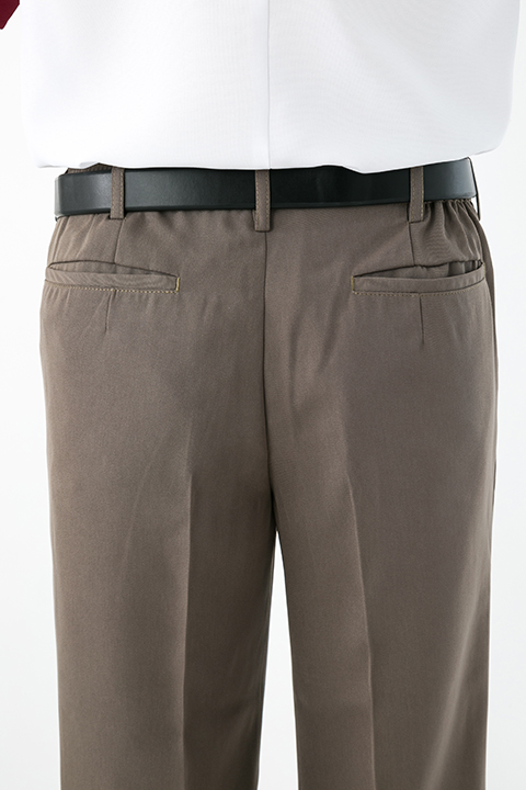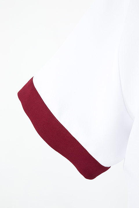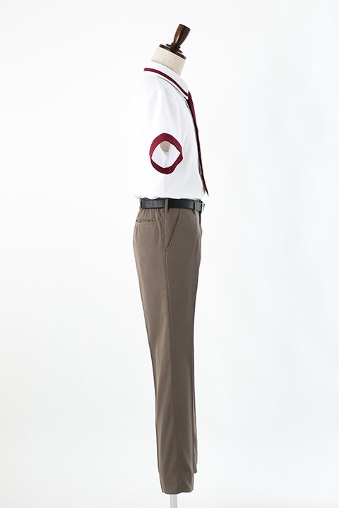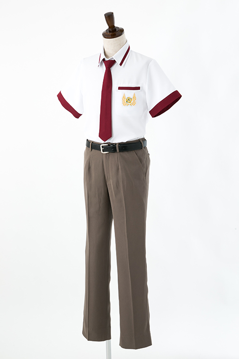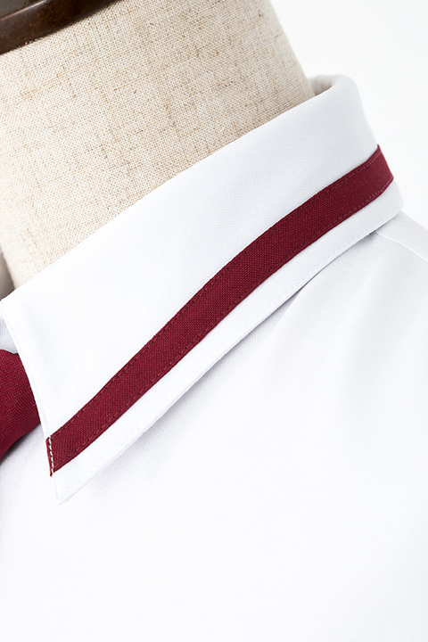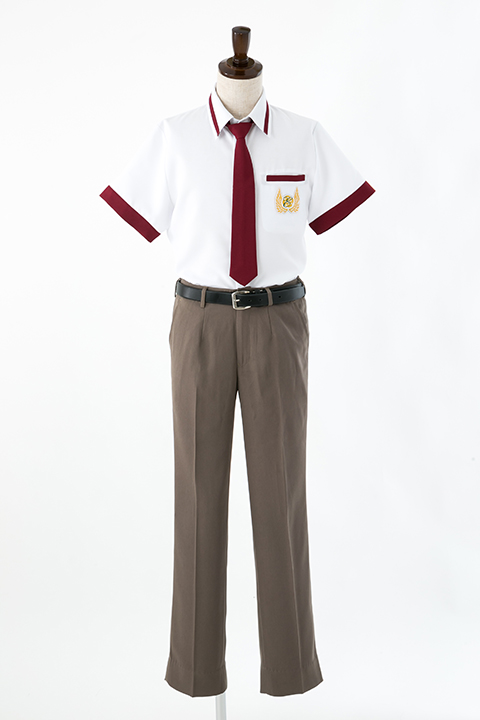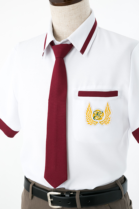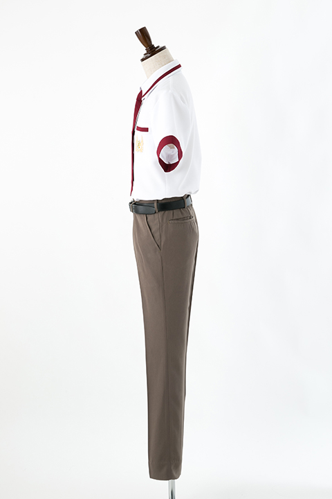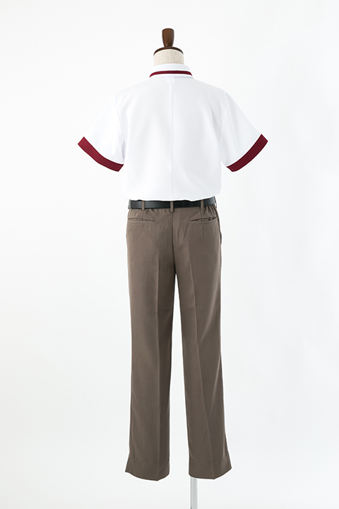 高等部の男子生徒が着用する夏制服。ワインレッドのラインが入ったシャツに、ネクタイ、パンツのセットです。シャツは通気性がよく、シワになりにくいオックス生地を使用。設定イラストに合わせ、背中心で身頃を切り替えています。