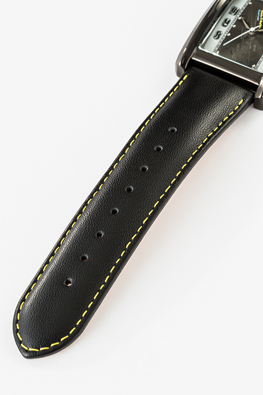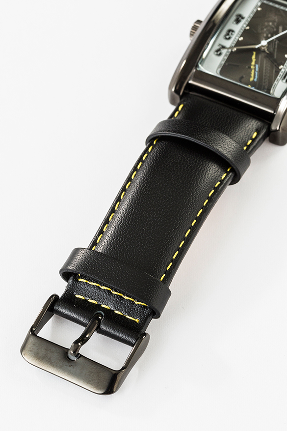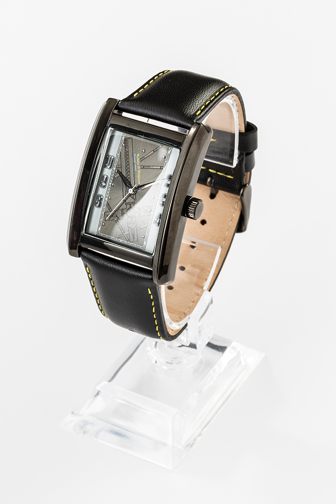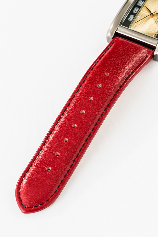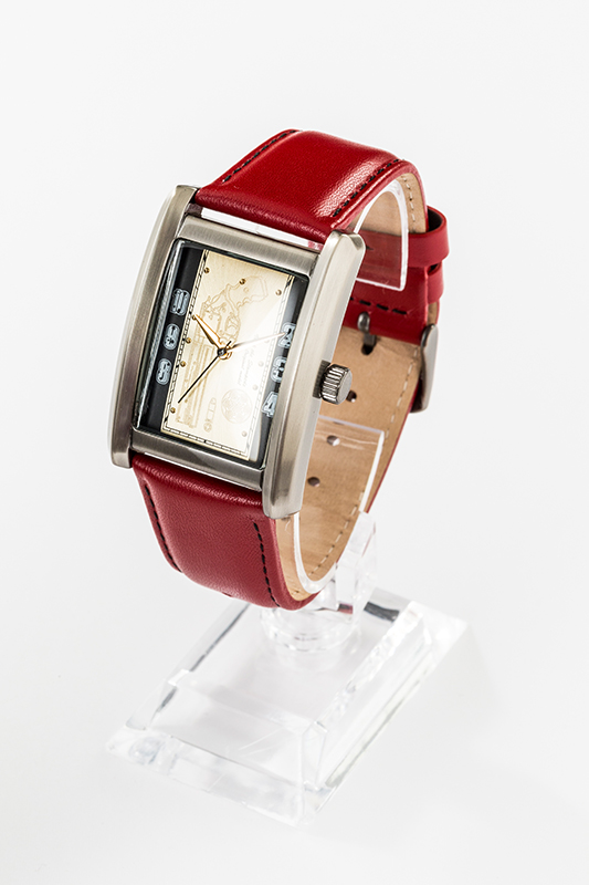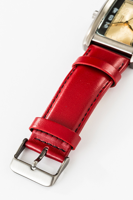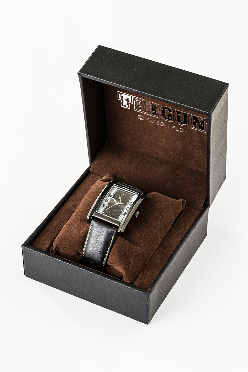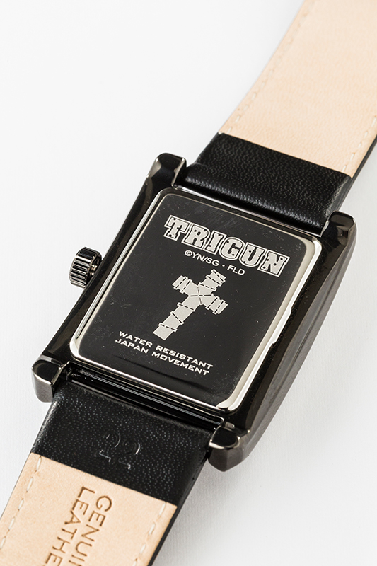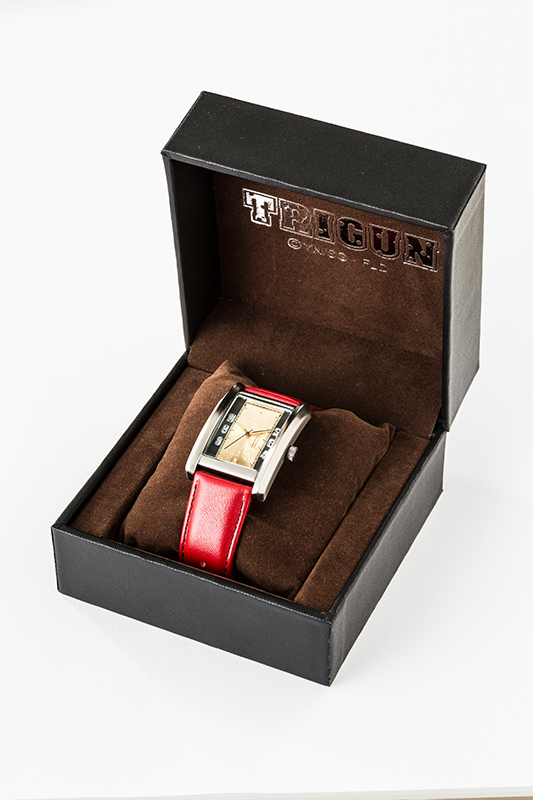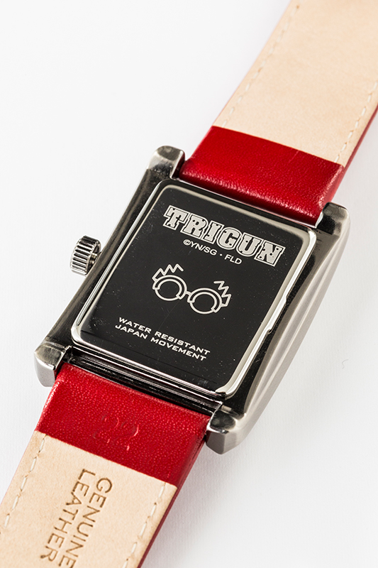 ヴァッシュモデルのリストウォッチは、時計の中心にヴァッシュの銃、シリンダー、弾が描かれており、数字はタイトルロゴを模した描き起こしのものとなっている。ベルトの色は、ヴァッシュがまとうコートの色をイメージした赤だ。