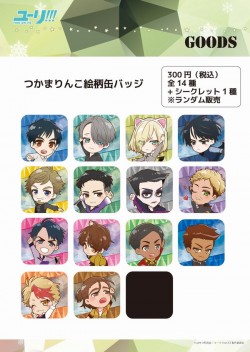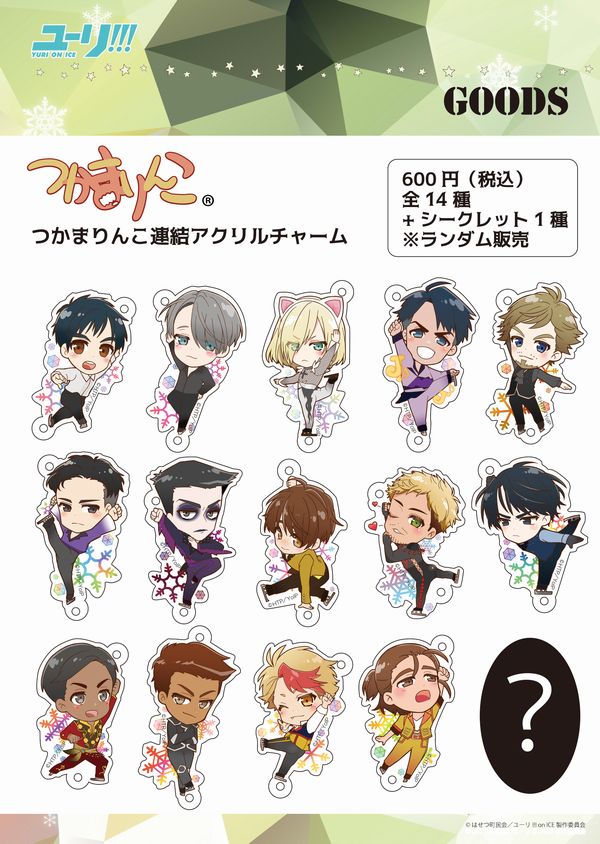 『ユーリ!!! on ICE』のスケーターたちが、『つかまりんこ』シリーズに登場! 発売されるのは連結アクリルチャームと缶バッジの2アイテム。どちらもスケーターごとの絵柄14種+シークレット1種のランダム販売となる。衣装をまとってポーズを決める勇利たちが超かわいいのはもちろん、ユリオの猫耳姿やポポーヴィッチの“カラボス”メイクも見逃せない! 商品は、2017年1月28日(土)よりアニメガカフェ ヴィーナスフォート店で先行発売され、以降2月には全国のアニメガ各店などにて取り扱われるとのこと。気になる『ユーリ!!!』ファンはぜひチェックして。